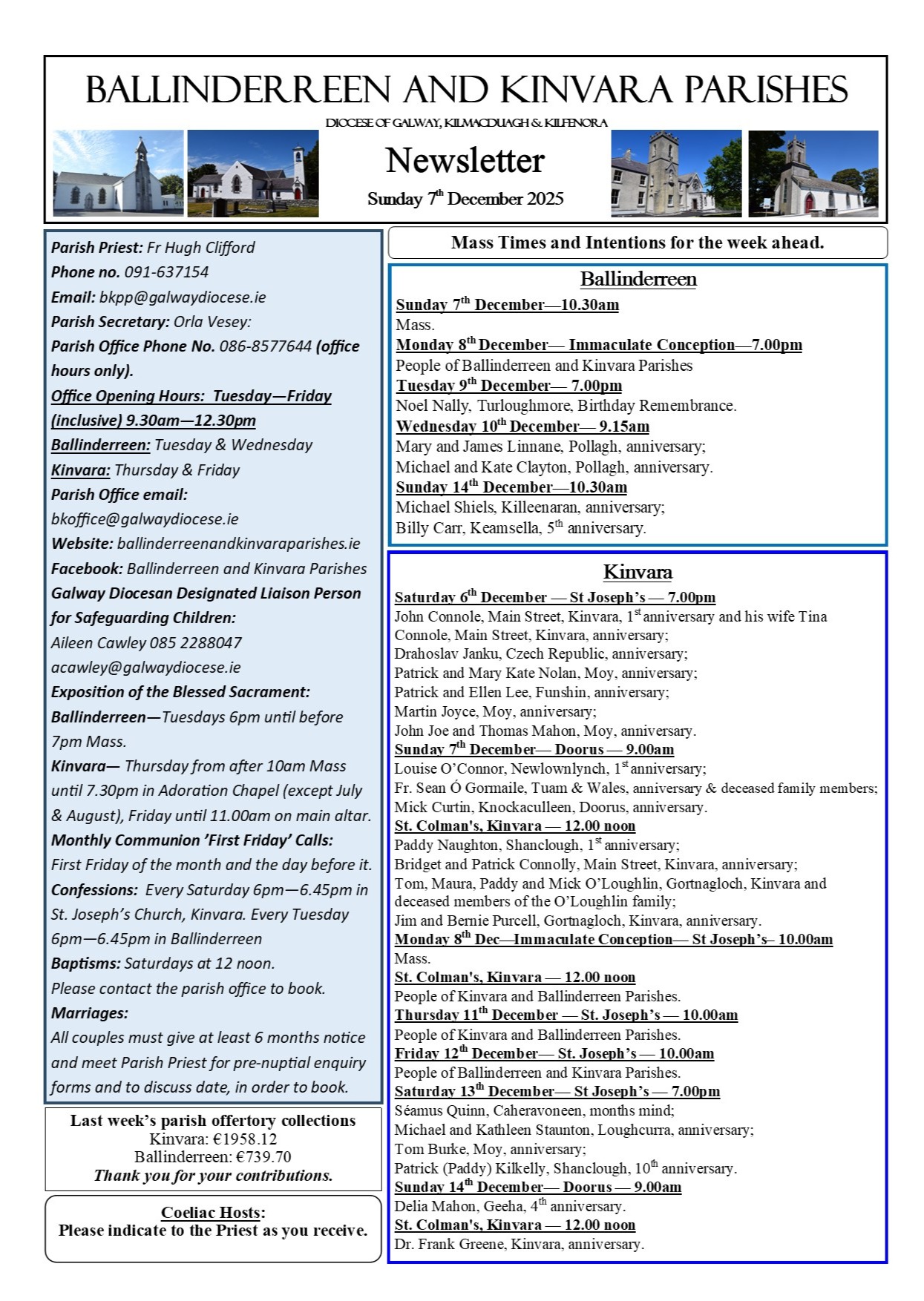 Parish Christmas cards are now available in the porches of Ballinderreen Church and St Joseph’s Church, Kinvara. €3 per card. Please place the money in one of the brown envelopes and put it in the letterbox of the Parish Office in Ballinderreen or the Parochial House in Kinvara. (Please don’t use the white envelopes for the money or we will not have enough envelopes for the cards!) Nine Masses will be offered during the Christmas period for those to whom the cards are sent. The proceeds all go towards the upkeep of the Churches and the mission of the parishes.