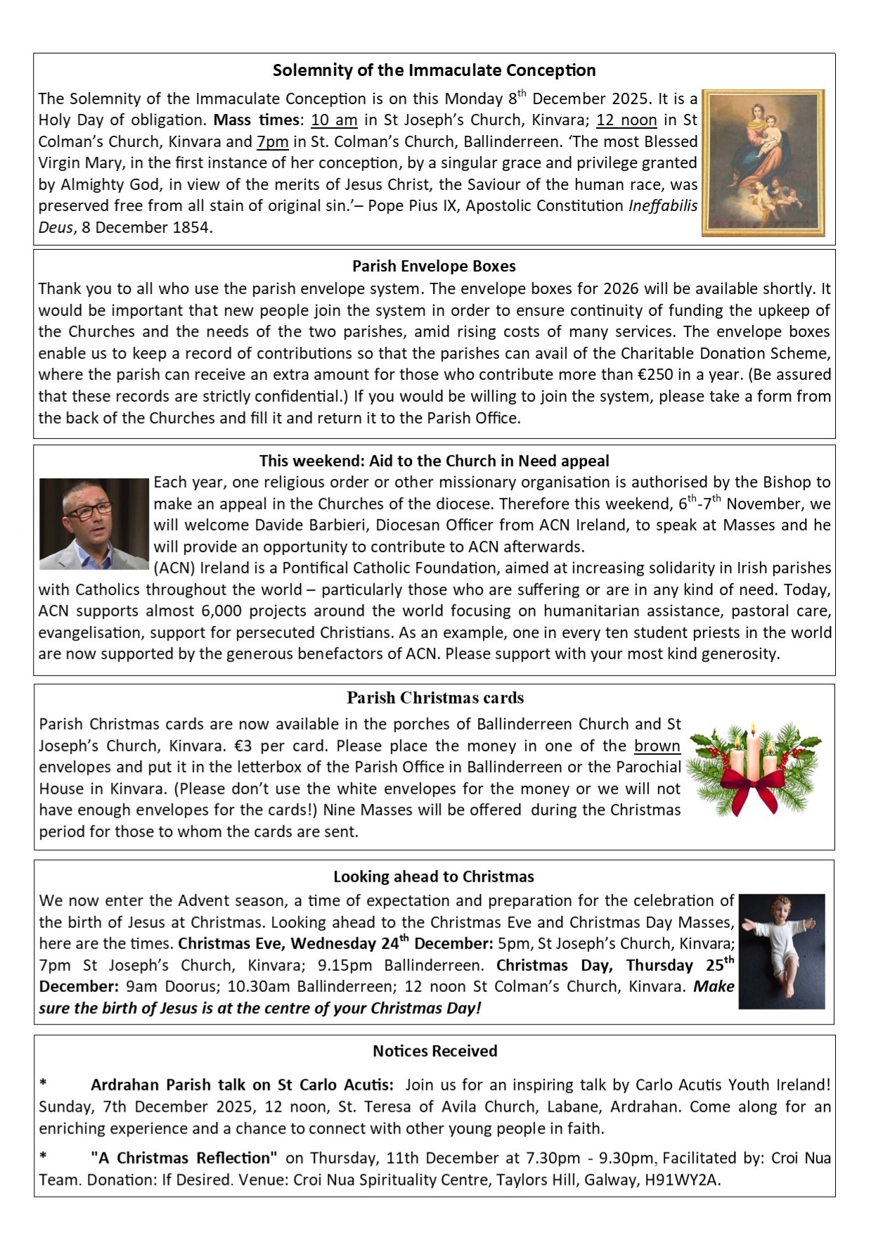 The Parish Office is now closed for the Christmas break and will re-open on Wednesday 7th January 2026 at 9.30am. We thank Orla Vesey, the Parish Secretary for all her great work and kindness to parishioners during the year and wish her and family a very happy Christmas.