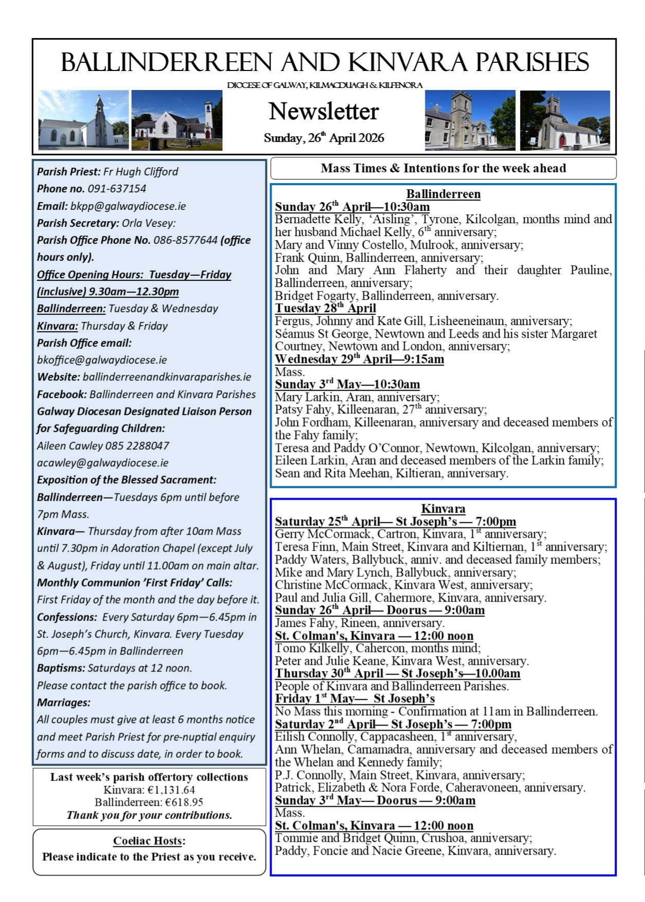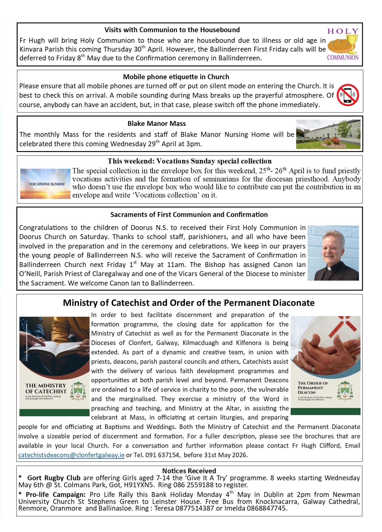 Thursday 26th March 2026: No 10am Mass. Sacrament of Confirmation in St Joseph’s Church, Kinvara for St Joseph’s NS at 11am, and for Doorus NS and Northampton NS at 3pm. Adoration continues as usual from 10.30am to 7.30pm. The Parish Office is closed today.